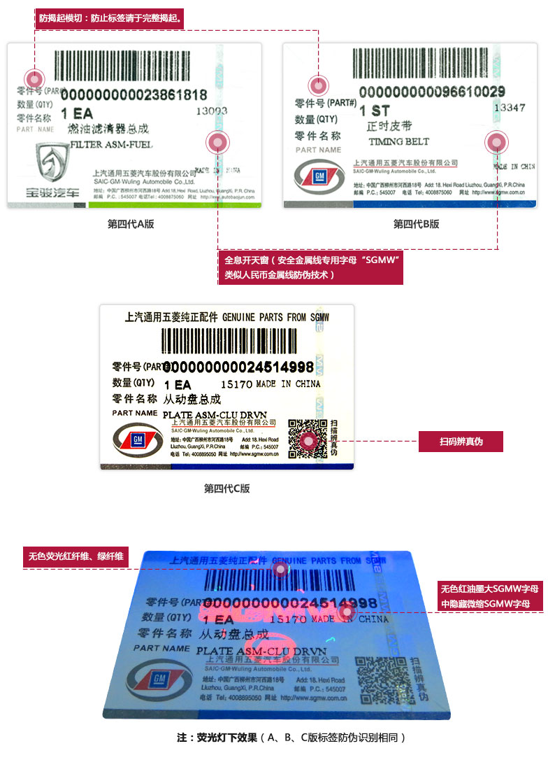 上汽通用五菱自2005年以来已更新过4代纯正配件的防伪标签,以下是目前主要使用的第3、4代纯正配件防伪标签,供广大用户识别: